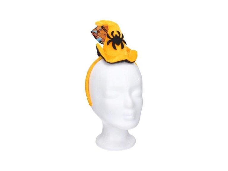 Karnevalová čarodějnická čelenka. Klobouček v výrazné žluté barvě je zdoben motivem pavouka.