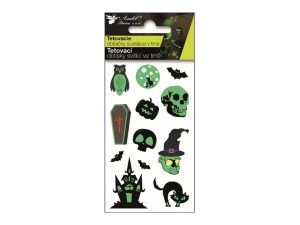 Stylové tetovací obtisky s halloweenskými motivy, které po nasvícení svítí ve tmě a vytvoří zajímavý efekt, zejména večer. Na archu najdete mix motivů, jako jsou lebky, netopýři, strašidelný dům, kočka nebo dýně. Jednotlivé obrázky lze libovolně kombinovat a vytvořit si vlastní originální vzhled. NÁVOD: 1. Vystřihněte zvolený motiv a odstraňte krycí fólii. 2. Obrázek přitiskněte na čistou suchou pokožku. 3. Shora vodou navlhčete podkladový papír obrázku, přidržte 20 sekund na pokožce a pak ho opatrně sejměte. 4. Obrázek nechejte 60 sekund zaschnout. Tetování lze odstranit pomocí lihu, krému, běžným mytím nebo dětským olejíčkem. Rozměr archu: 10,5 x 6 cm Uvedená cena je za 1 arch.