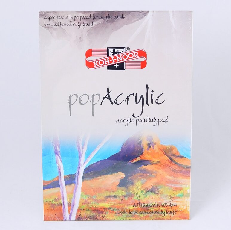 Vysoce kvalitní papír pro malování akrylovými barvami. V horním a dolním okraji slepený. Na přední obálce v horní části mašle, název Pop Acrylic, barevný motiv, formát A3 – 10 listů, 400 g/m2. V horním a dolním okraji slepený. Rozměr bloku 420 x 297 x 6 mm. Hmotnost bloku 0,74 kg. Zadní část obálky: karton. Lepení: v hlavě. Na záložce obálky na zadní straně bloku – jazykové mutace, text v anglickém jazyce na přední obálce. Blok je zabalen v POF fólii.