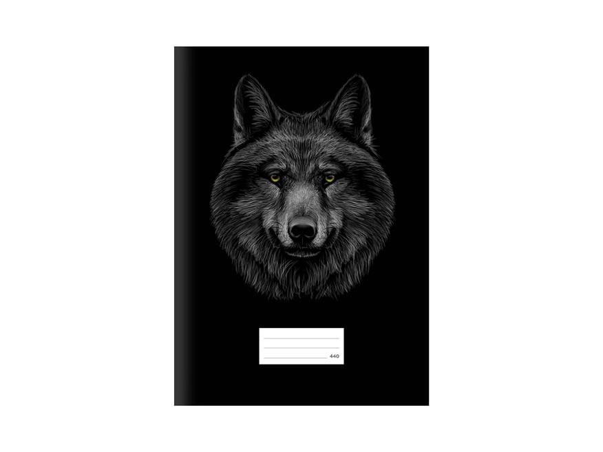 Školní sešit bez linek ve formátu A4, v černé barvě, s motivem vlka, v originálních deskách s matným laminem a lokálním UV lakem.
