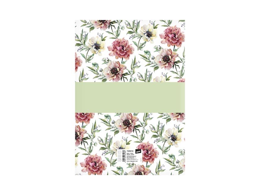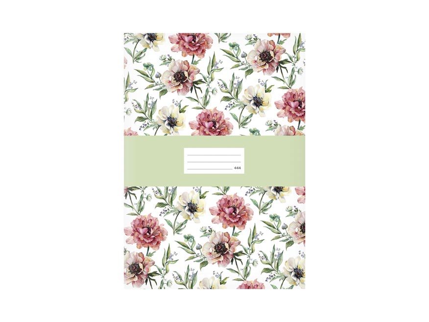 Školní sešit s linkou ve formátu A4, v bílo – zelené barvě, s motivem květin, v originálních deskách s matným laminem a lokálním UV lakem. Stránky jsou opatřeny okraji o šířce 1,5 cm.
