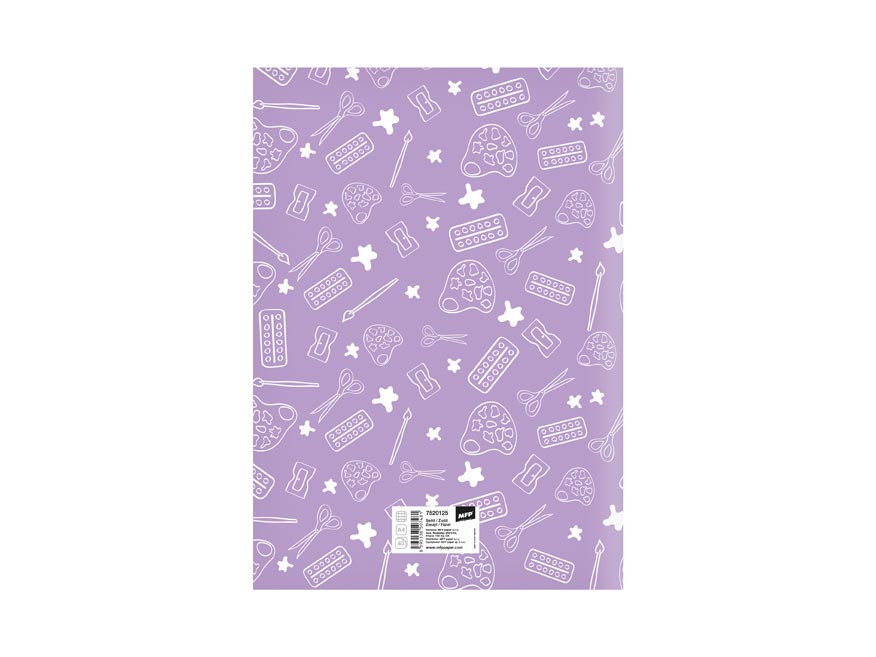 Školní sešit čtvereček ve formátu A4, ve fialové barvě, s motivem výtvarných potřeb, v originálních deskách s matným laminem a lokálním UV lakem. Stránky jsou opatřené okraji o šířce 1,5 cm.
