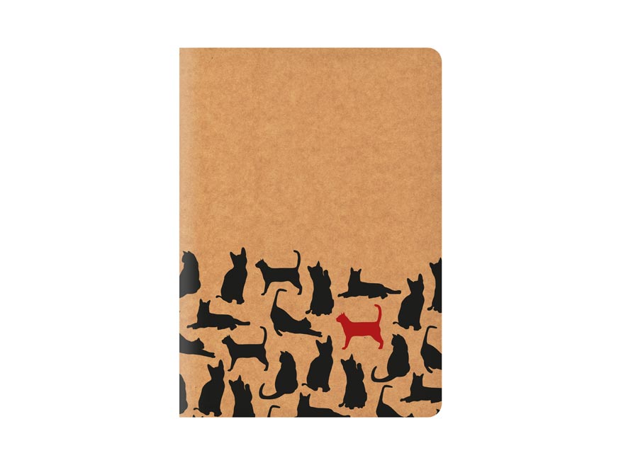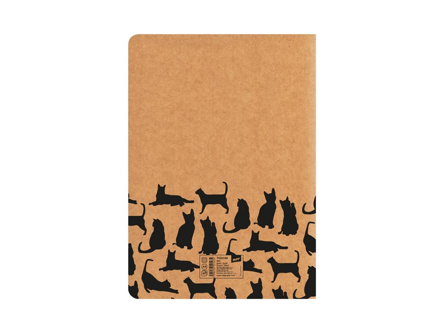 Školní sešit s linkou ve formátu A4, v hnědé barvě, s motivem koček, v originálních deskách z kraftového papíru. Stránky jsou opatřeny okraji o šířce 1,5 cm.