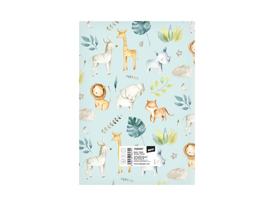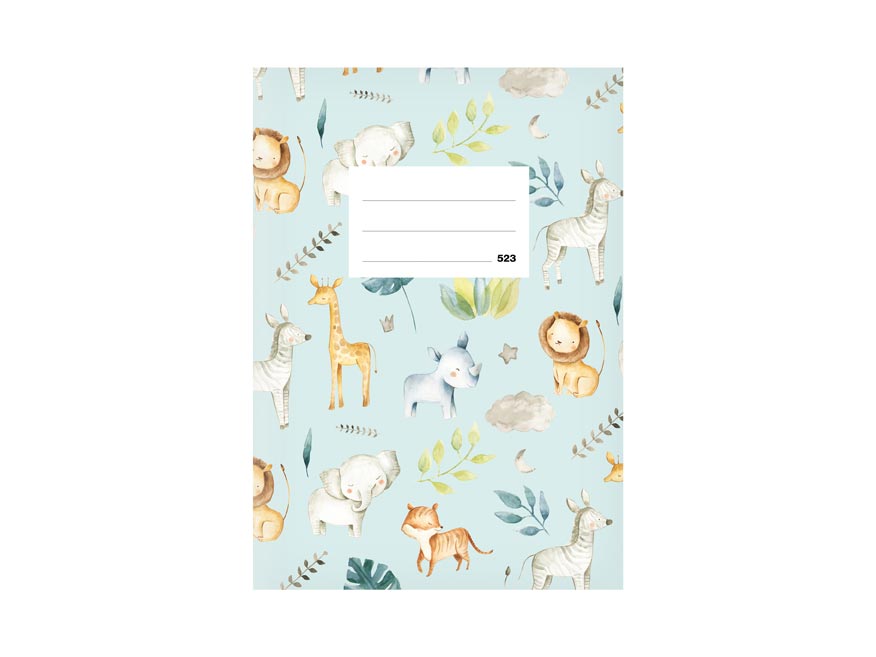 Školní sešit s linkou ve formátu A5, v modré barvě, s motivem exotických zvířat, v originálních deskách s matným laminem a lokálním UV lakem. Stránky jsou bez okrajů.
