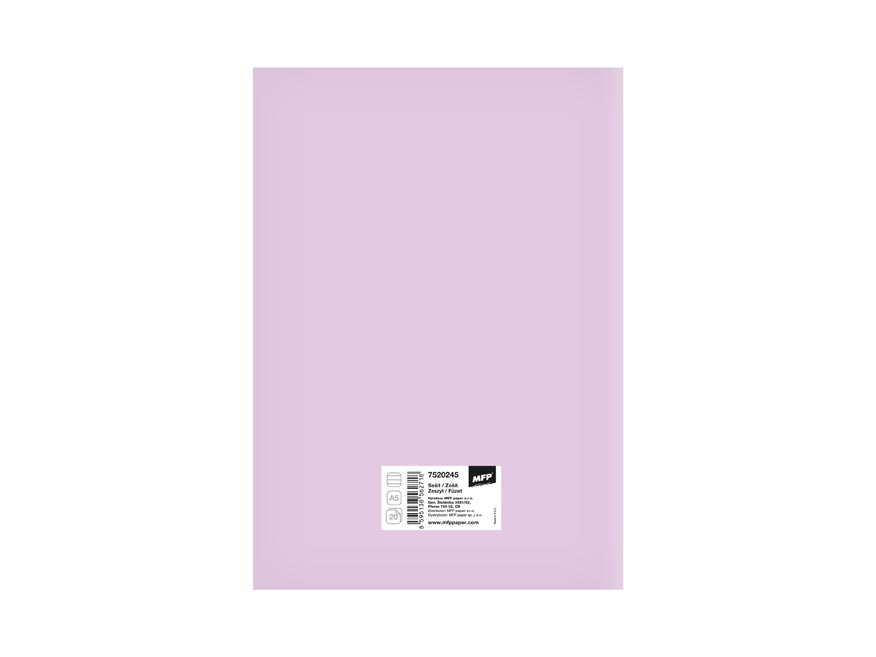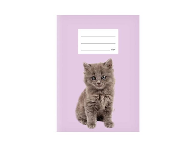 Školní sešit s linkou ve formátu A5, ve fialové barvě, s motivem kočky, v originálních deskách s matným laminem a lokálním UV lakem. Stránky jsou bez okrajů.