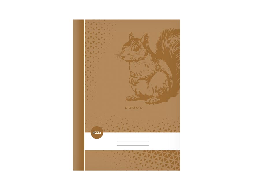 Školní sešit linkovaný/čistý ve formátu A4, v hnědé barvě, s motivem veverky, v deskách z křídového papíru. Každá stránka je ze 2/3 linkovaná a z 1/3 čistá. Sešit je určený pro žáky I. stupně ZŠ.