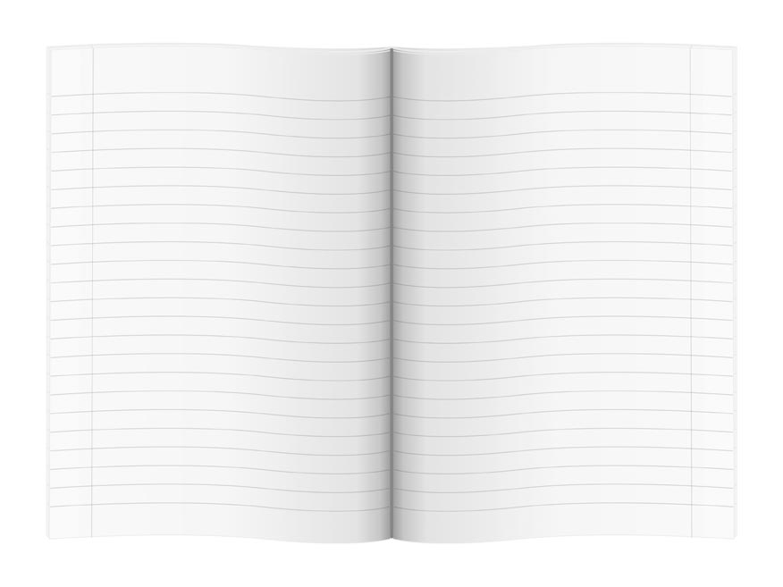 Školní sešit s linkou ve formátu A5, v modré barvě, s motivem psa, v deskách z křídového papíru. Stránky jsou opatřeny okraji o šířce 1,5 cm.