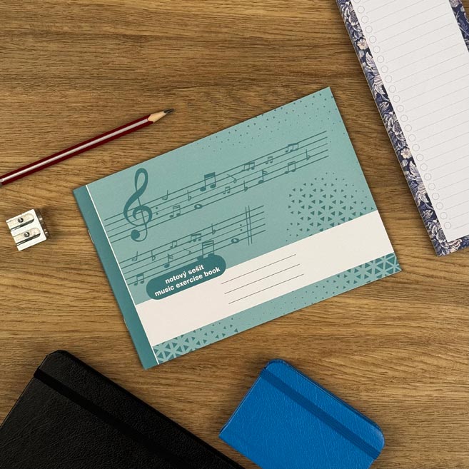 Sešit obsahuje 16 listů s přehledně vyznačenou notovou osnovou, ve které má každá nota své místo. Ležatý formát A5 zajišťuje pohodlné psaní a skvěle sedí na lavici i na notový stojan. Obálka v jemné tyrkysové barvě s hudebním motivem působí svěže a inspirativně.