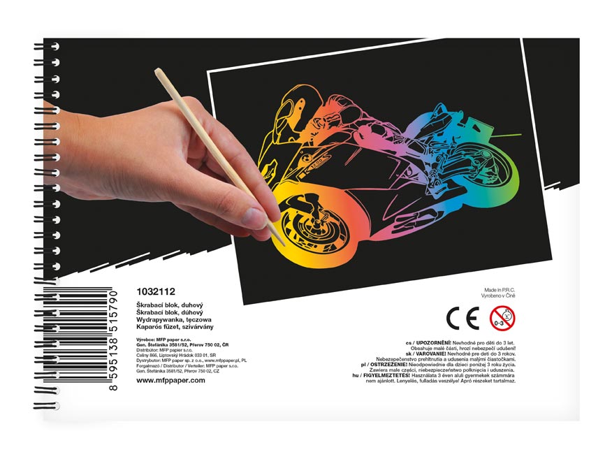 Vyškrabovací notes s perem. Dopřejte si chvilku odpočinku a kreativně se vydovádějte na vyškrabovacím notesu. Na jednotlivých listech můžete pomocí vyškrabovacího pera vytvářet různé pestrobarevné obrázky. Dítě si zlepší motoriku ruky a naučí se kreslit.