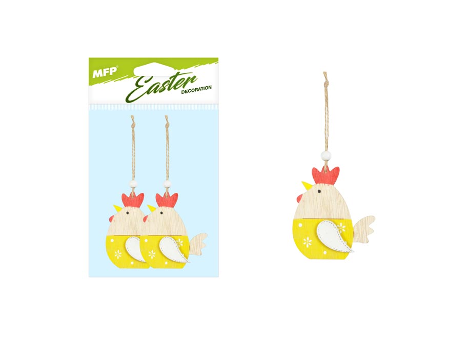 Krásná velikonoční dekorace v designu dřevěné žluté slepičky se závěsem, poslouží jako dekorace do exteriéru nebo na zkrášlení interiéru. Dekorace má provázek na zavěšení.