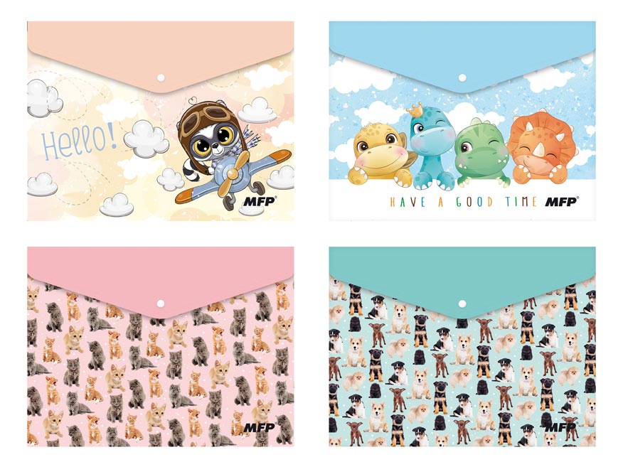 Složka z PolyPropylenu (PP), která se zavírá pomocí druku ve formátu A5, s dětským potiskem, v pastelových barvách. Složka slouží jako pomocník pro třídění a ukládání dokumentů, takže je budete mít vždy pohromadě.