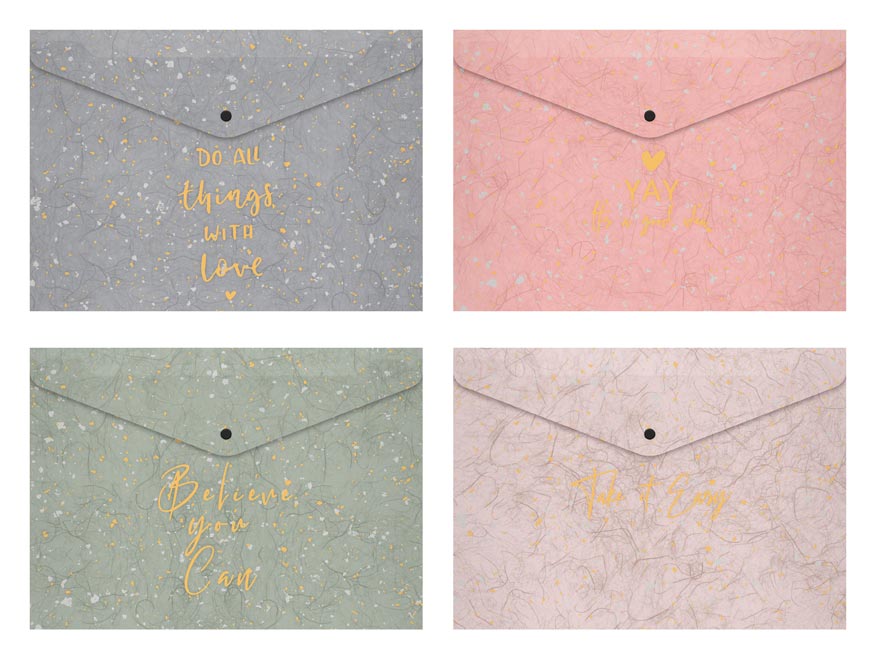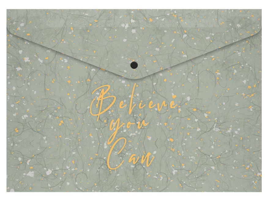 Složka A5 z PolyPropylenu (PP), která se zavírá pomocí druku, se zajímavou texturou a motivačním textem. Složka slouží jako pomocník pro třídění a ukládání dokumentů, takže je budete mít vždy pohromadě.