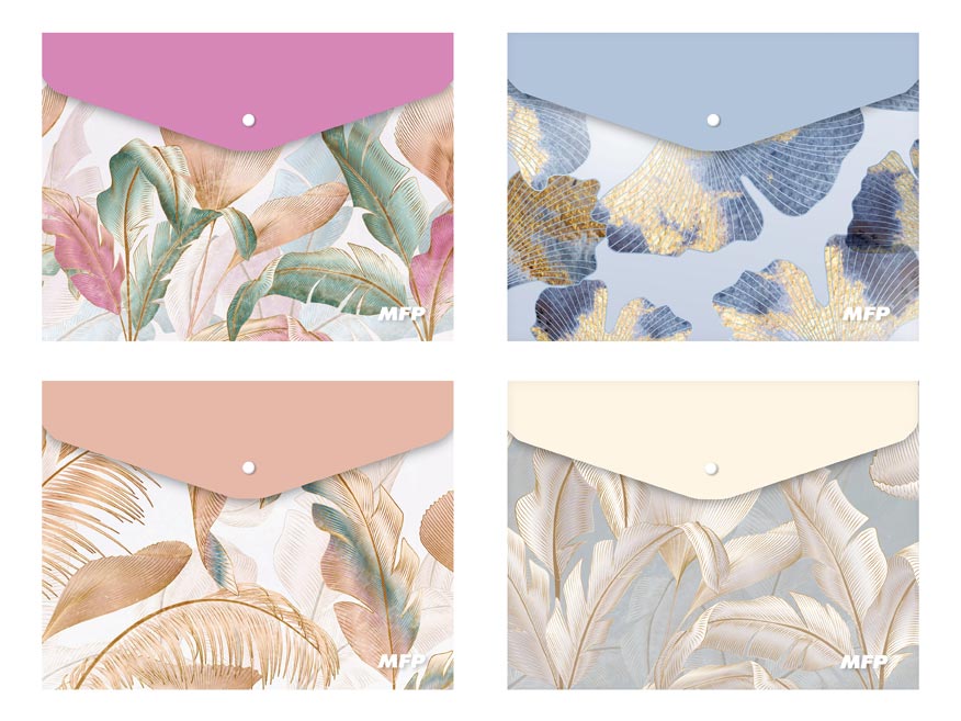 Díky široké škále elegantních vzorů a barevných potisků má každý kousek jedinečný vzhled, který dodá vašim pracovním materiálům nebo studijním poznámkám nádech originality. Lehký, ale odolný materiál umožňuje snadné přenášení, zatímco praktické zapínání na druk zajistí, že obsah složky bude vždy bezpečně uložen.