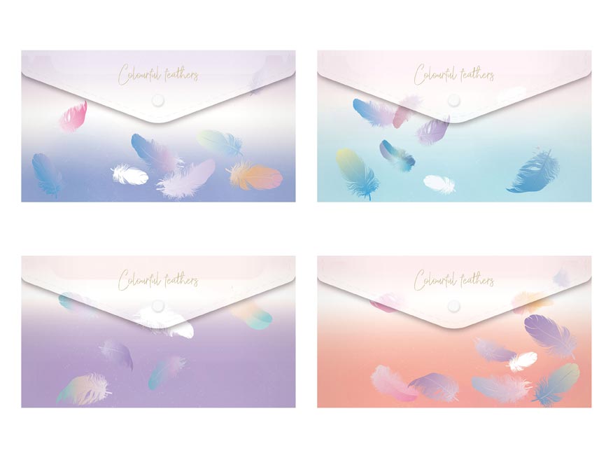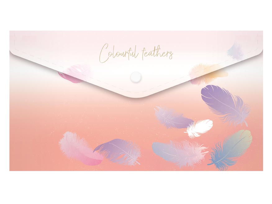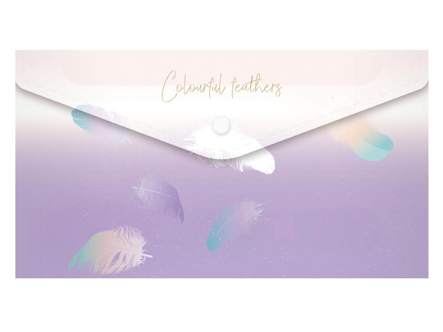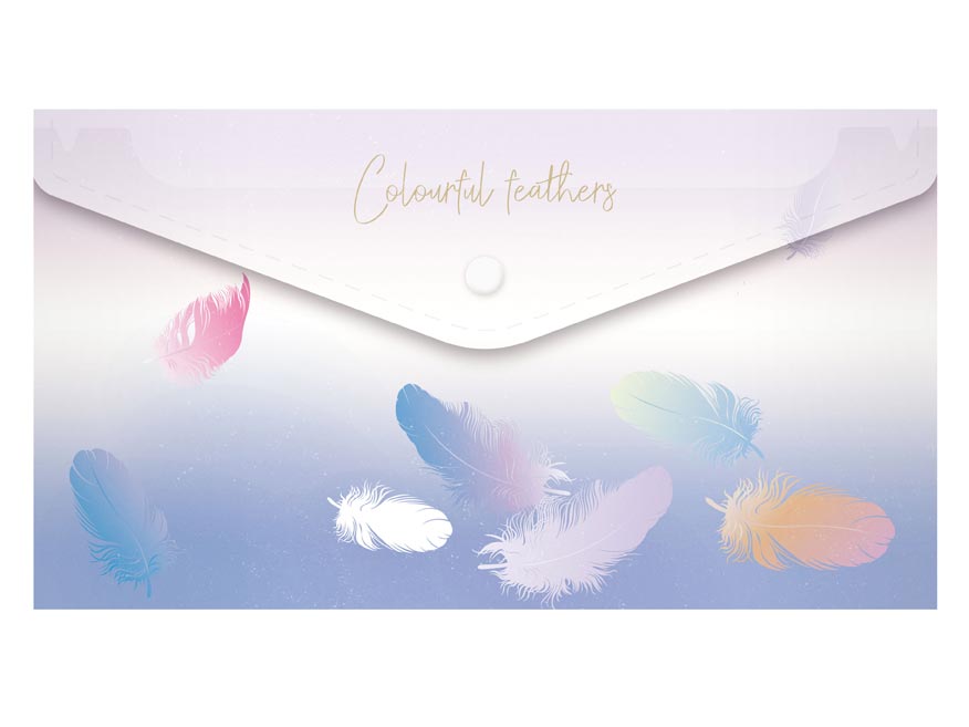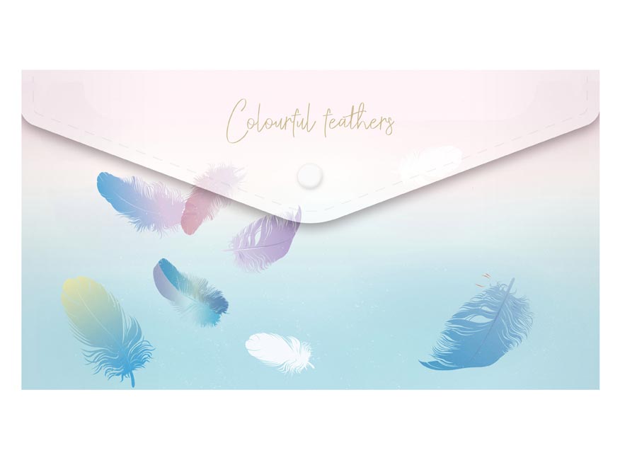 Složka z PolyPropylenu (PP), která se zavírá pomocí druku, ve formátu DL, s uvolněným motivem pírek, v mixu barev. Formát DL je dvojmo přeložený papír A4. Složka slouží jako pomocník pro třídění a ukládání dokumentů, takže je budete mít vždy pohromadě.