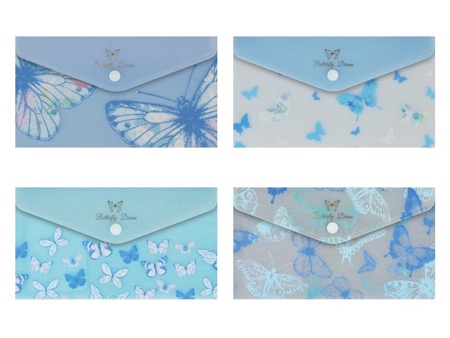 Lehká a praktická plastová složka s drukem ve formátu DL je ideální pro ukládání dopisů, účtenek, dokumentů nebo listů A4 přeložených na třetiny. Motýlí motiv v modrých odstínech dodává složce jemný a příjemný vzhled.