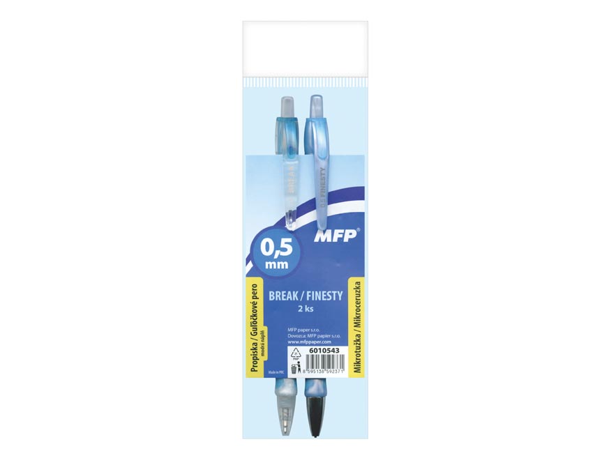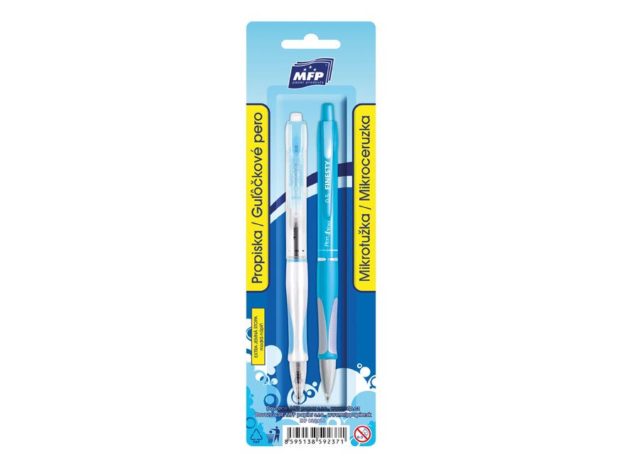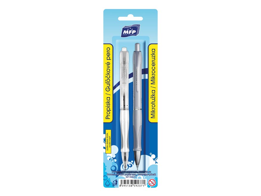 Souprava psacích potřeb – propiska + mikrotužka 0,5. Kvalitní plastová propiska s vyměnitelnou náplní v setu s mikrotužkou 0,5. Tyto tužky jsou ergonomicky tvarované a příjemně sedí v ruce.