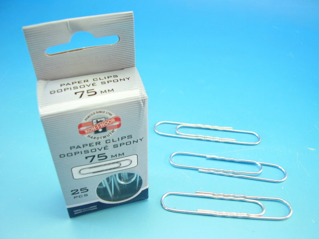Dopisové spony 75 mm, průměr drátu 1,60 mm, délka 75 mm, šířka 6 mm. Drát je z pokoveného zinku. 150 ks spon je uloženo v papírové krabičce. Spony se používají např. na sepnutí více kusů papírů.