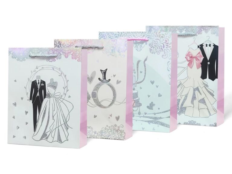 Dárková papírová taška M LUX se svatebním motivem. Dárkové tašky jsou skvělé na dárky, které lze jen těžko zabalit do balícího papíru. Velmi praktické jsou také pro ty, co dárky neradi balí nebo to moc neumí a nebyli by spokojeni se svým výsledkem.