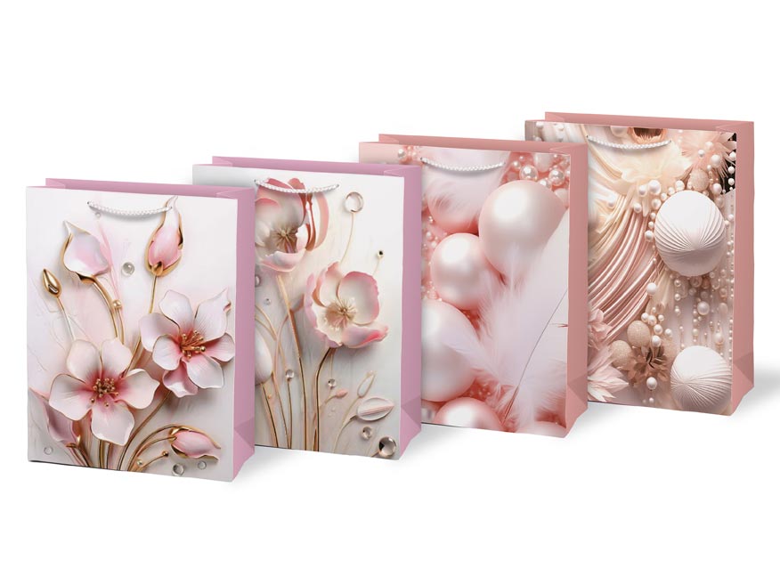 Dárková papírová taška MFP M LUX okouzlí jemným designem v odstínech růžové, bílé a zlaté. Kombinace květů, perel a peří vytváří dojem lehkosti a slavnostní atmosféry.