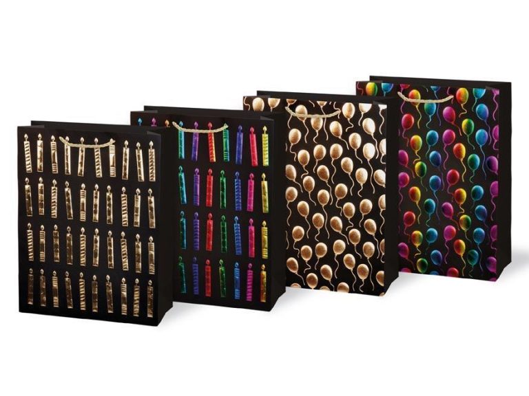 Dárková papírová taška M LUX přináší do balení dárků slavnostní atmosféru. Tmavý podklad zvýrazňuje lesklé motivy svíček a balónků, které působí hravě, ale zároveň elegantně. Každý design je navržen tak, aby podtrhl radostný charakter okamžiku.