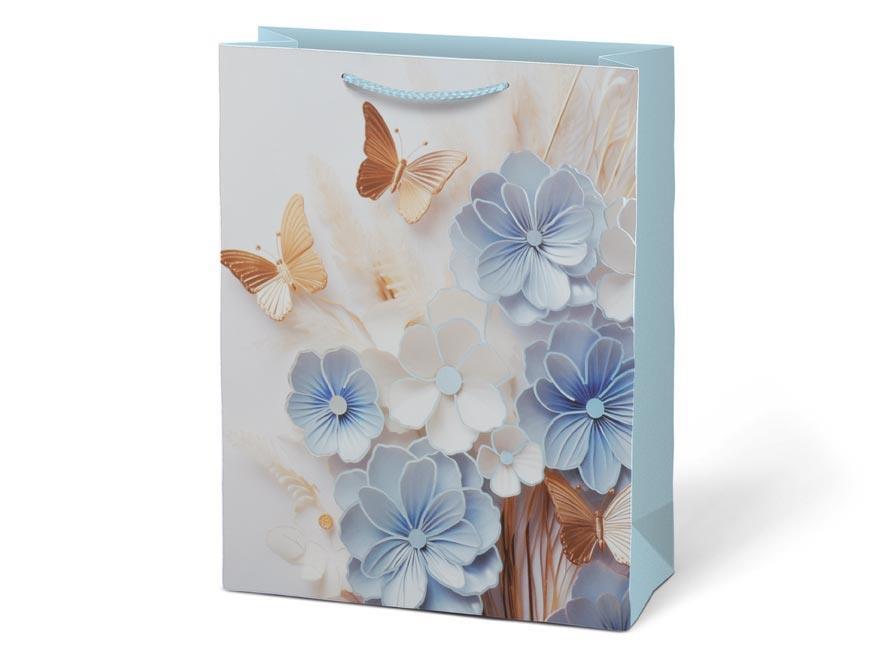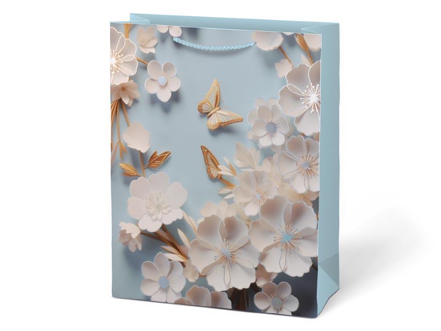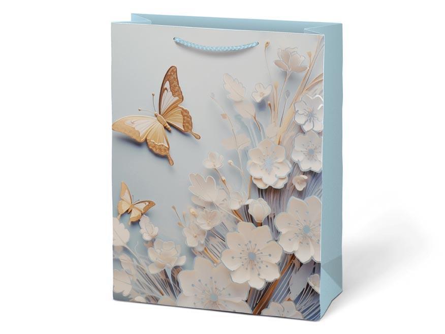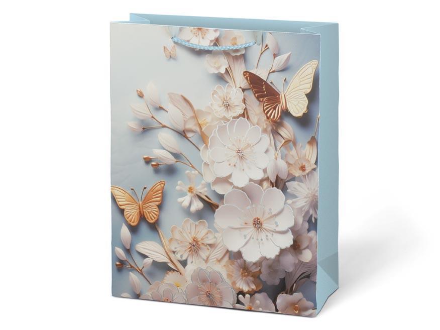 Dárková papírová taška M LUX zaujme elegantním květinovým motivem doplněným o zlaté motýly. Jemné pastelové barvy v kombinaci se zlatavými detaily působí vzdušně a dodávají dárku výjimečný vzhled.