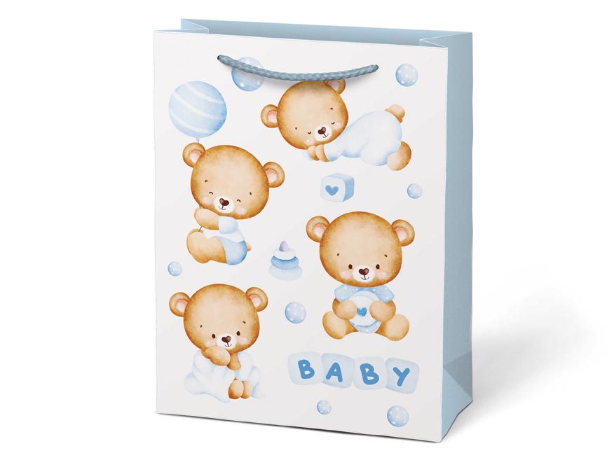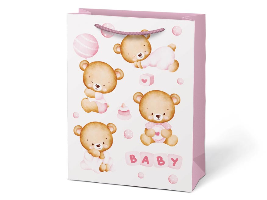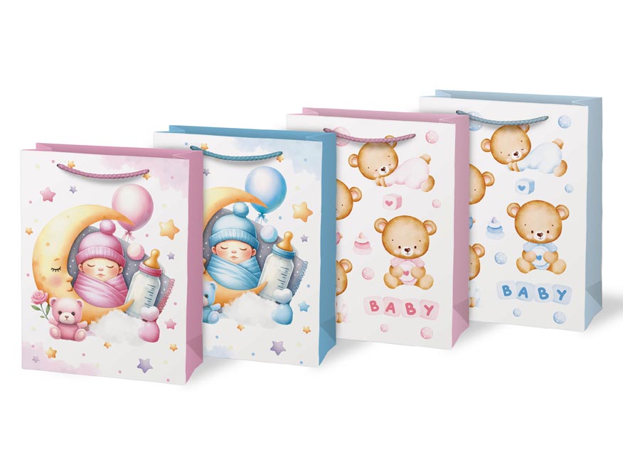 Dárková papírová taška T4 s děrskými motivy. Na výběr jsou dva dívčí a dva chlapecké motivy. Je ideální pro předání dárků při příležitostech, jako je baby shower, křtiny nebo oslava narození miminka. Tato dárková taška dodá vašemu daru osobitý a láskyplný nádech. Předejte svůj dárek novopečeným rodičům v elegantním a roztomilém balení.