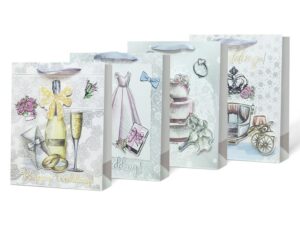 Dárková, papírová taška L LUX se svatebním motivem. Dárkové tašky jsou skvělé na dárky, které lze jen těžko zabalit do balícího papíru. Velmi praktické jsou také pro ty, co dárky neradi balí nebo to moc neumí a nebyli by spokojeni se svým výsledkem. Motiv: svatební Rozměr: 260 x 320 x 120 mm Dodáváme v mixu po 4 ks dle skladové zásoby. Uvedená cena je za 1 ks.