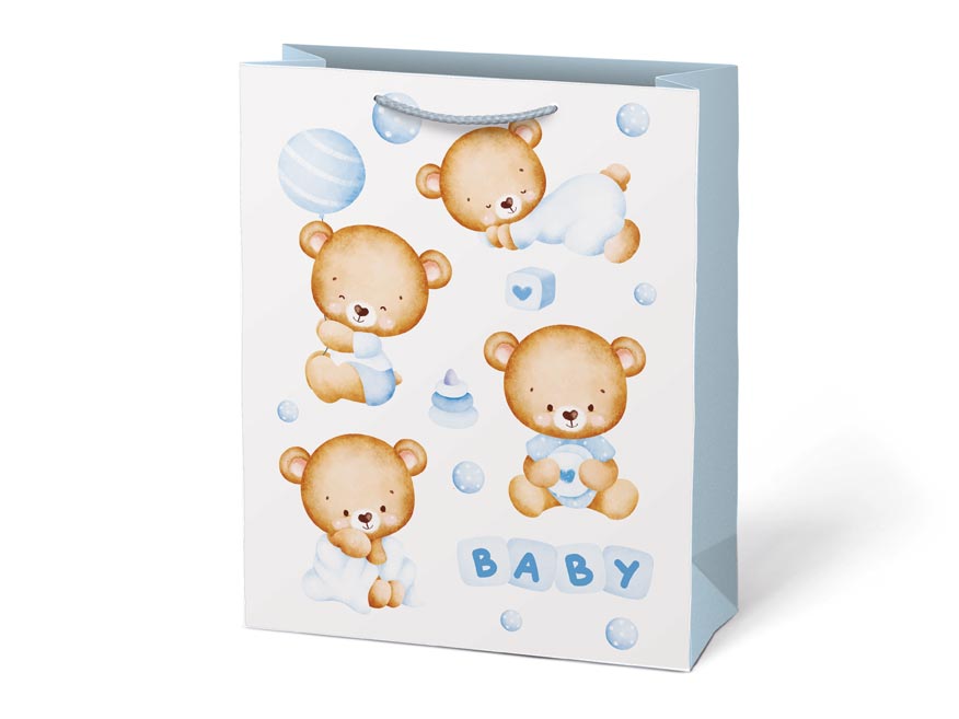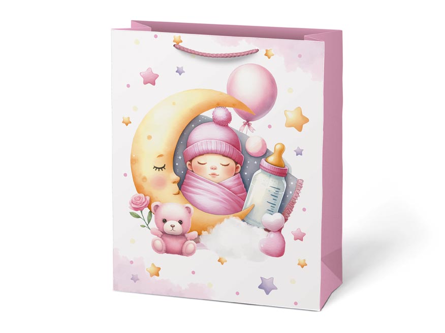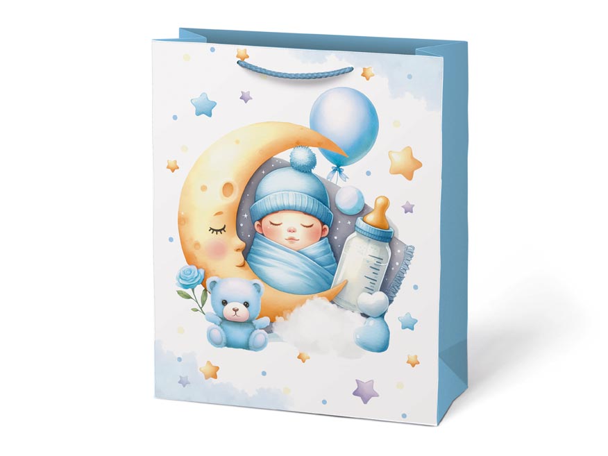 Dárková papírová taška T5 s dětskými motivy. Na výběr jsou dva dívčí a dva chlapecké motivy. Je ideální pro předání dárků při příležitostech, jako je baby shower, křtiny nebo oslava narození miminka. Tato dárková taška dodá vašemu daru osobitý a láskyplný nádech. Předejte svůj dárek novopečeným rodičům v elegantním a roztomilém balení.