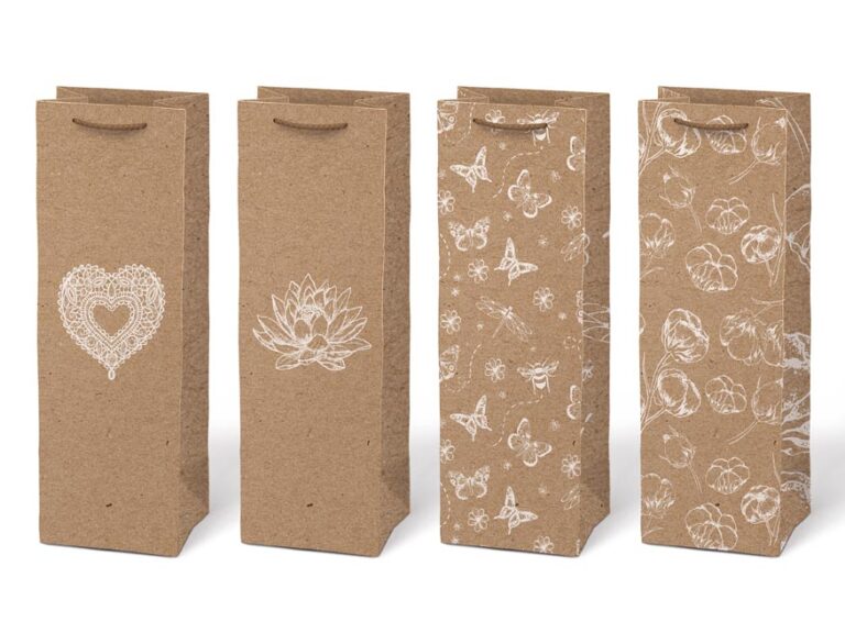 Tyto tašky jsou nejen praktické, ale také nádherně stylové. Vyrobené z kraftového papíru, spojují ekologický přístup s moderním designem. Jsou ideální pro standardní láhve vína, šampaňského, domací limonády nebo úzké lahve do výšky 36 cm.