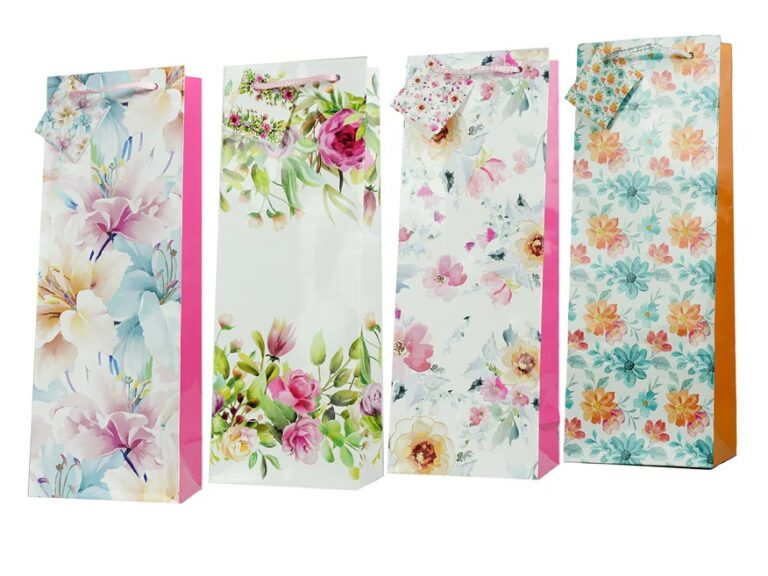 Dárková papírová taška T12 vhodná na láhev vína nebo jinou lahvinku. Krásný, květinový design zaručí spokojenost obdarovaného. Taška má pevné ucho pro snadné přenášení a štítek pro vepsání jména či přání.