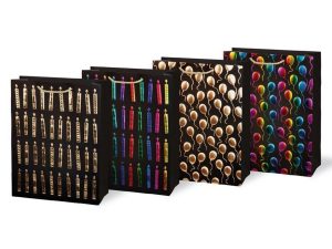 Dárková papírová taška M LUX přináší do balení dárků slavnostní atmosféru. Tmavý podklad zvýrazňuje lesklé motivy svíček a balónků, které působí hravě, ale zároveň elegantně. Každý design je navržen tak, aby podtrhl radostný charakter okamžiku. Taška se hodí pro menší dárky k narozeninám nebo jiným oslavám. Pletené provázkové uši umožňují pohodlné přenášení. Motiv: svíčky, balónky Rozměry: 180 x 230 x 100 mm Barva: černá s metalickým potiskem Dodáváme v mixu 2 motivů a 2 barevných provedení dle aktuální skladové dostupnosti. Uvedená cena je za 1 ks.