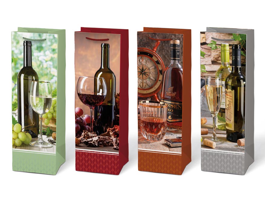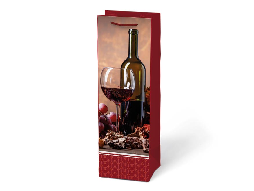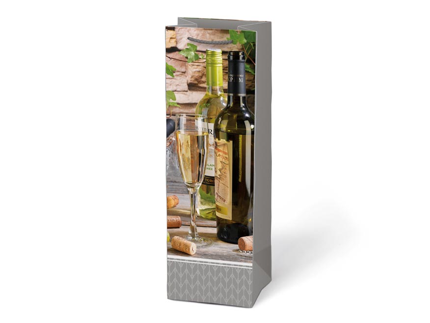Dárková papírová taška T12 v mixu motivů, každý s elegantním a atraktivním designem. Je vhodná pro různé druhy lahví, nejen pro víno. Lze ji použít i pro likéry, oleje, nebo jiné nápoje v lahvích. Tato stylová taška je opatřena pevným uchem pro snadné a pohodlné nošení. Použití dárkové tašky eliminuje potřebu složitého balení. Darujte lahev originálně a elegenatně.