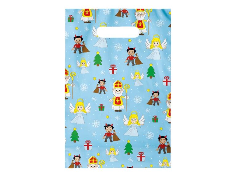 Igelitová taška s průhmatem v Mikulášském motivu. Na tašce je obrázek Mikuláše, anděla, čerta a vánočních dárků. Ideální na zabalení dobrot, sladkostí a na další mikulášskou nadílku pro děti.