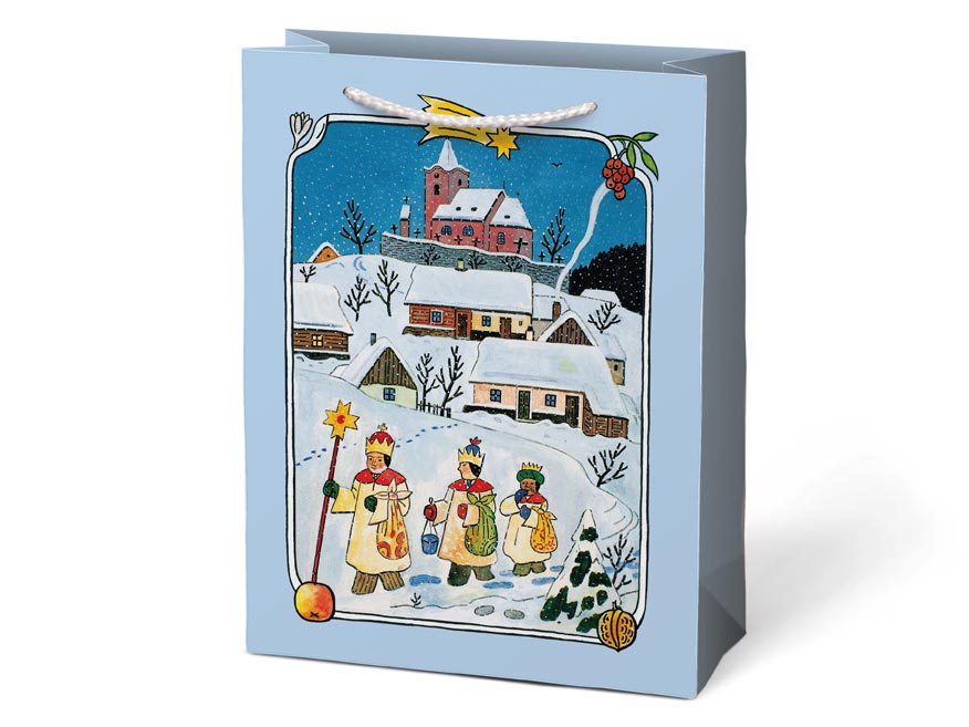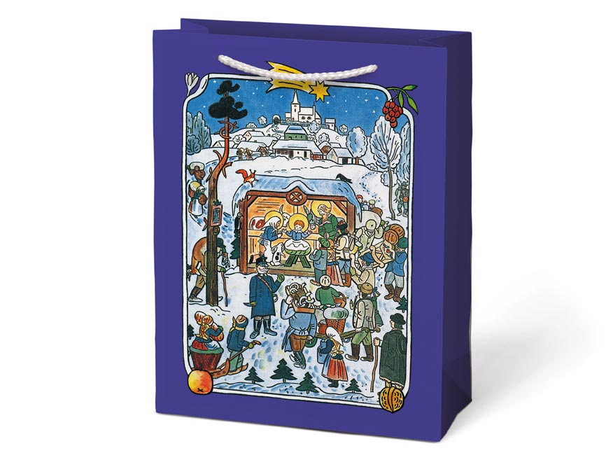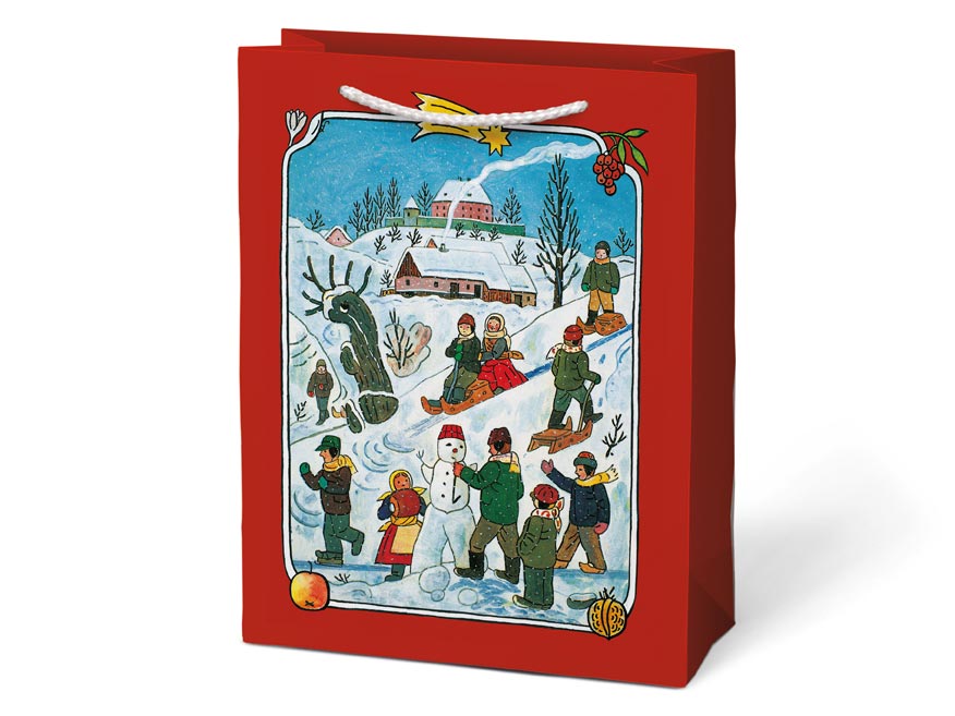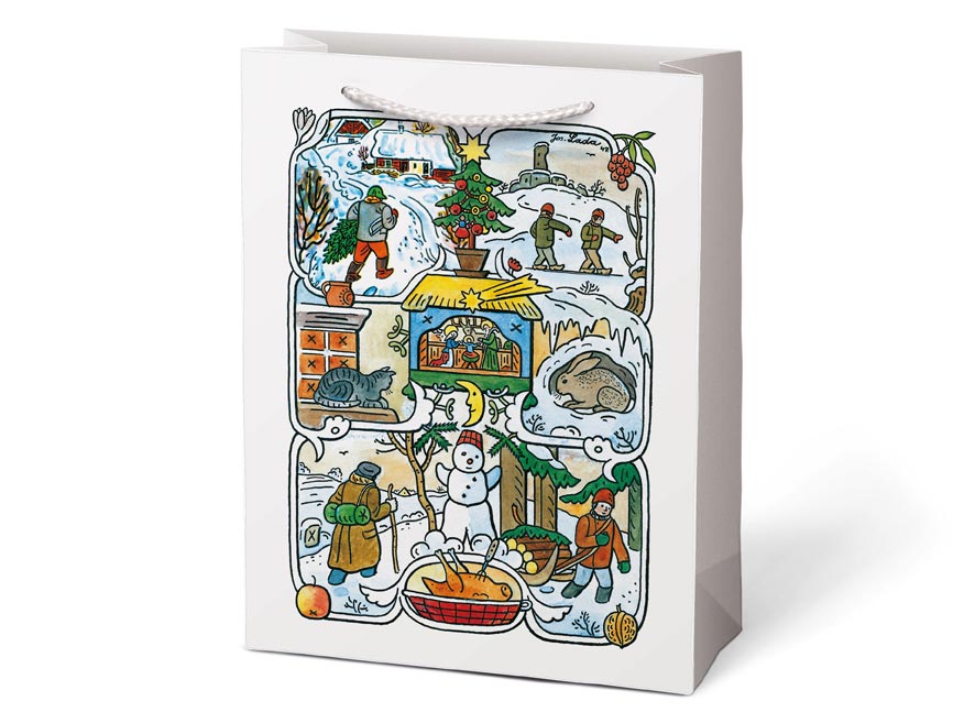 Vánoční dárková papírová taška T10 s vánočními motivy od Josefa Lady. Je ideální na předání dárků, které je těžké zabalit do dárkového balícího papíru. Taška má pevné ucho pro snadné přenášení a štítek pro vepsání jména či přání.
