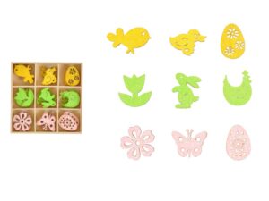Velikonoční plastová vajíčka (prolis) v mixu pastelových barev a motivů. Vajíčka mají provázek na pověšení. Vyzdobte si svůj domov krásnými velikonočními vajíčky, které Vám vytvoří okouzlující atmosféru Velikonoc! Tuto dekoraci můžete použít na dekorování velikonočních věnců nebo větviček. BALENÍ OBSAHUJE: - 6 ks plastových vajíček Velikost: 60 mm Barva: modrá, žlutá, 2 x zelená, fialová, oranžová Uvedená cena je za 1 balení.