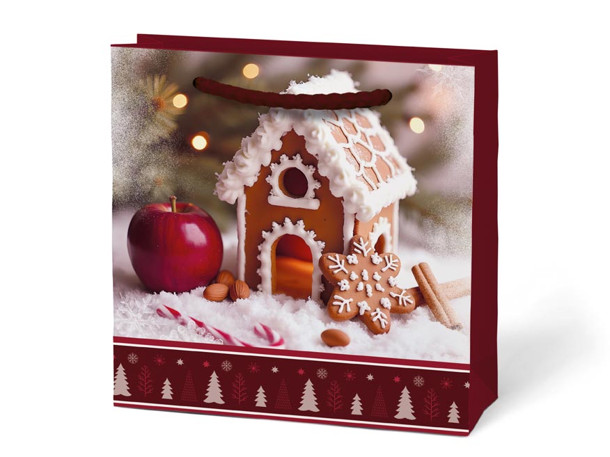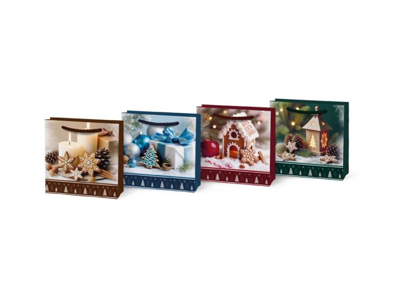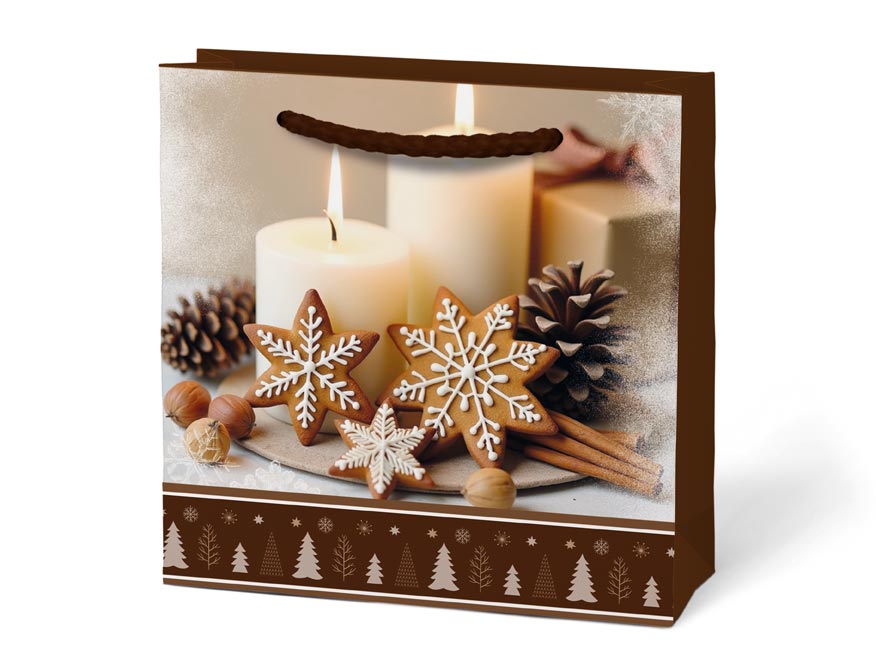 Dárková papírová taška T0 s bohatým vánočním motivem – ideální na drobné dárky, přání nebo malou pozornost. Realistické fotografie se svíčkami, perníčky, dárky nebo zimními dekoracemi vytvářejí teplou a slavnostní atmosféru.