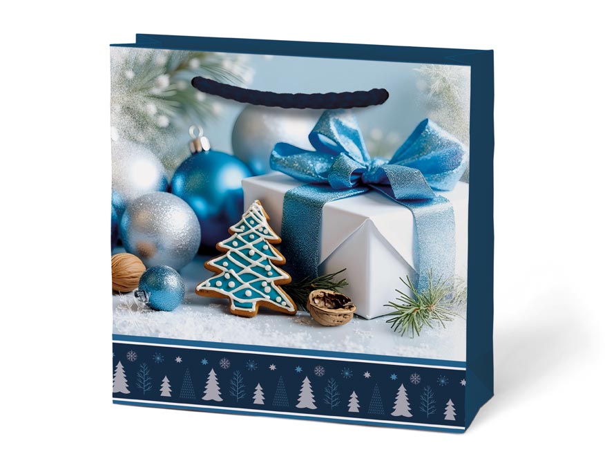 Malý formát tašky působí mile a osobně. Je opatřena pevnými šňůrkovými uchy a spodním dekorem s vánočním motivem, který celé balení krásně doladí. Skvělá volba pro drobnosti, které potěší nejen obsahem, ale i balením.