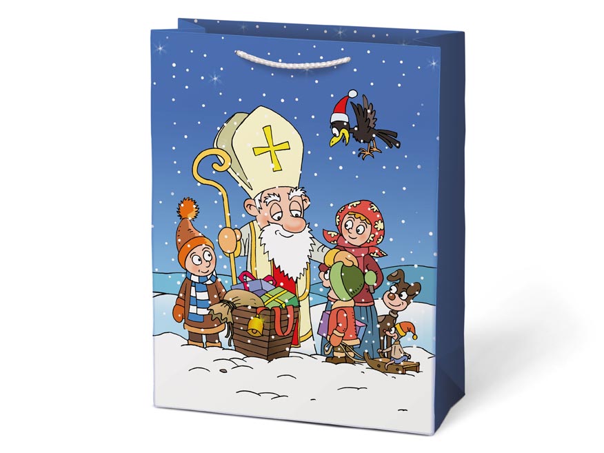 Papírová dárková taška T5 s motivem Mikuláše nebo čertů. Tašky dodáváme ve dvou motivech, s čerty nebo s mikulášem. Taška je opatřena pevným uchem pro snadné nošení a kartičkou kam můžete napsat jméno nebo krátké věnování. Pokud nemáte čas balit dárek do dárkového balícího papíru tak právě pro Vás máme široký výběr dárkových tašek.