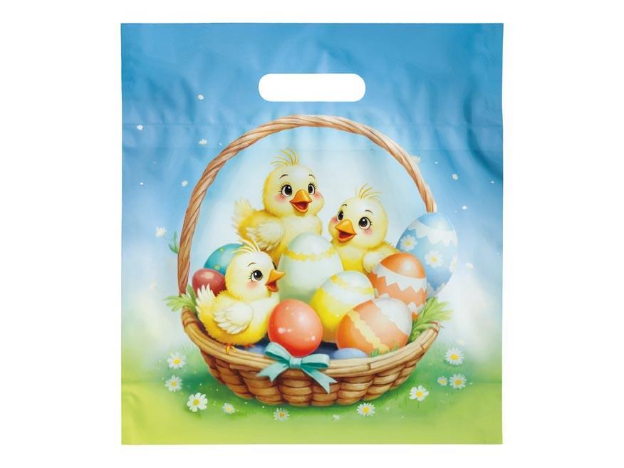 Košík plný barevných kraslic a veselá kuřátka vytvářejí hravý motiv, který si děti s Velikonocemi přirozeně spojují. Tato velikonoční igelitová taška MFP se hodí na velikonoční výslužku a umožňuje sladkosti a drobné pozornosti předat jednoduše a hezky.