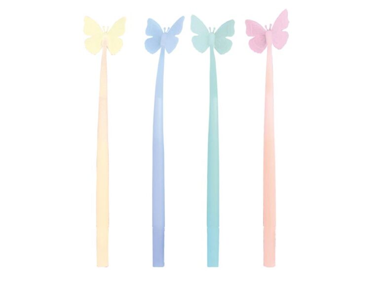 Zábavné gelové pero s modrou náplní s motýlem. Pero má příjemný úchop a díky
