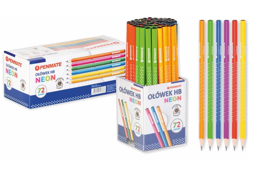 72/ trojhranná tužka bez gumy, hrocená, pr. tuhy 2,2mm, pr. tužky 7,3mm, balení obsahuje 72 ks tužek v plastovém stojánku, cena za kus, mix neonových barev