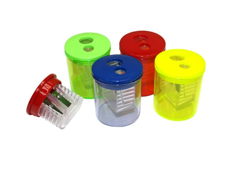 Plastové kulaté školní ořezávátko/strouhátko na 2 tužky se zásobníkem na odpad - ořezávátko patří