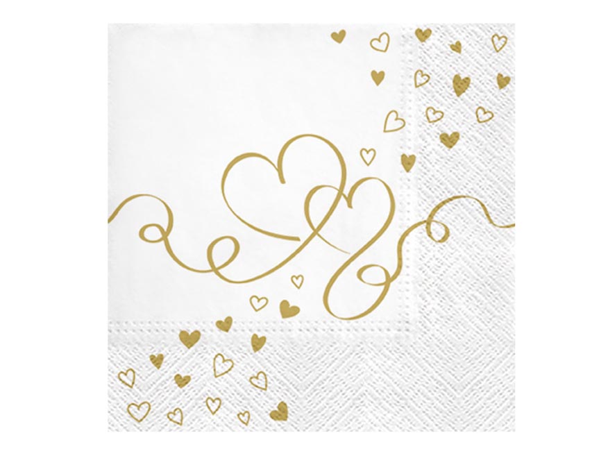 Dodejte svému stolu romantický a slavnostní nádech! Papírový ubrousek se zlatým motivem srdíček je ideální pro svatby, výročí, Valentýn, oslavy i slavnostní večeře.