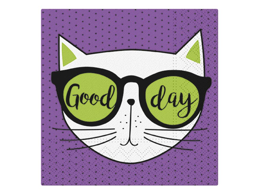 Třívrstvý papírový ubrousek. Krásné kvalitní ubrousky s motivem kočky v brýlích s nápisem „Good day“ na fialovém podkladu vykouzlí příjemnou atmosféru. Ideální na zahradní prostírání, oslavy nebo na zkrášlení interiéru.