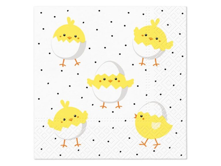 Papírový velikonoční ubrousek. Krásné velikonoční ubrousky s obrázky kuřátek ve skořápce dodají prostřenému stolu nádech přicházejícího jara a vykouzlí příjemnou atmosféru u slavnostního oběda nebo večeře. Ubrousek je kvalitní z třívrstvého papíru. Vhodný i na ubrouskovou techniku a různé dekorace.