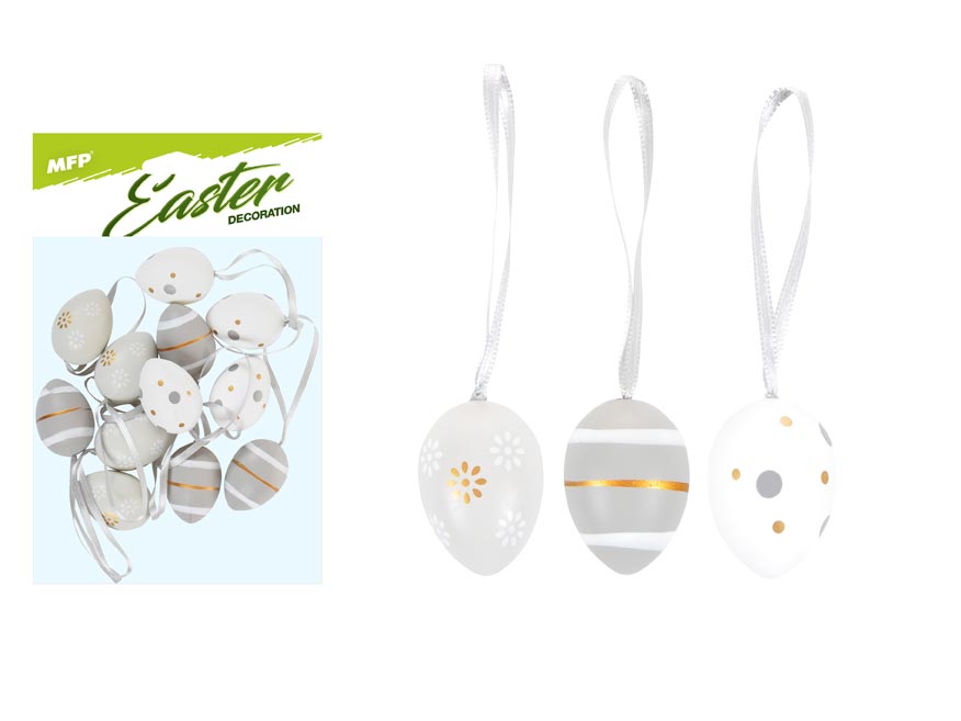 Velikonoční plastová vajíčka s malovanými motivy, v bílé a šedé barvě. Vajíčka mají stužku na pověšení. Vyzdobte si svůj domov krásnými velikonočními vajíčky, které Vám vytvoří okouzlující atmosféru Velikonoc! Tuto dekoraci můžete použít na dekorování velikonočních věnců nebo větviček.