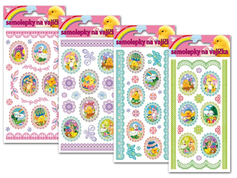 Samolepky na vajíčka velikonočními motivy beránků, kuřátek, zajíčků, a dalších symbolů velikonoc a jara.