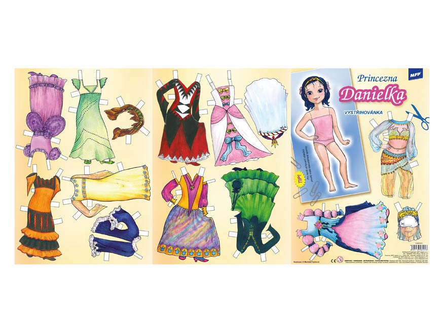 Vystřihovánky s princeznou Danielkou, vhodné pro mladé slečny. Obleč si princeznu Danielku podle svého vlastního vkusu. Vystřihovánky jsou na 2 listech formátu A4. Najdeš zde princeznu, spoustu různých šatů a doplňků. Vystřihovánky rozvíjejí kreativitu dětí pomocí různých tvarů, barev a také zlepšují motoriku ruky.