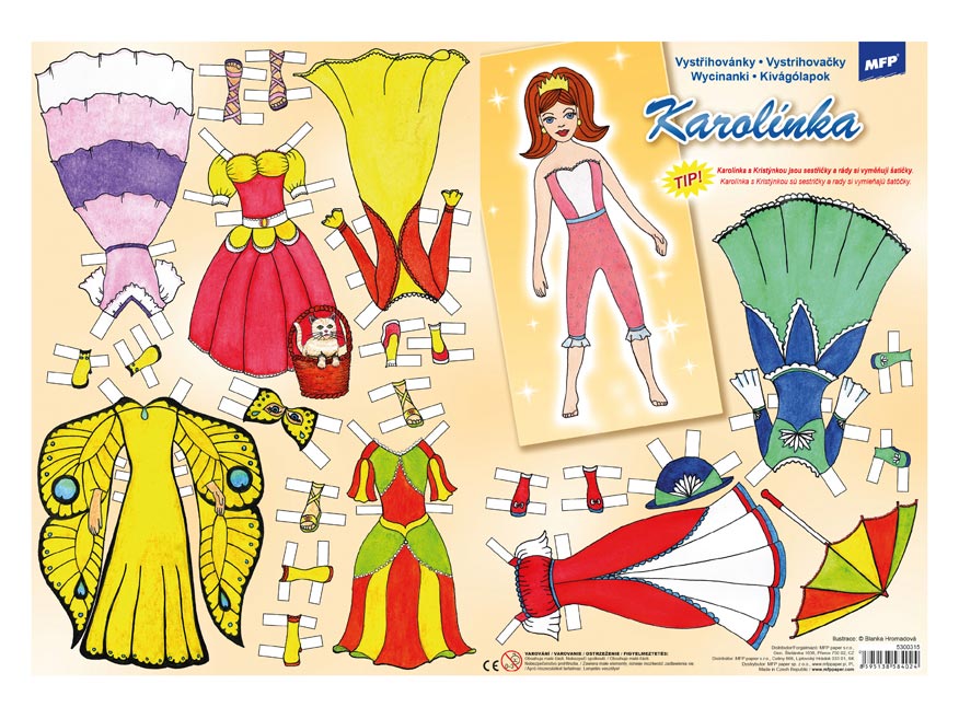 Vystřihovánky s princeznou Karolínkou, vhodné pro mladé slečny. Obleč si princeznu Karolínku podle svého vlastního vkusu. Vystřihovánky jsou na 2 listech formátu A4. Najdeš zde princeznu, spoustu různých šatů, střevíců a doplňků. Vystřihovánky rozvíjejí kreativitu dětí pomocí různých tvarů, barev a také zlepšují motoriku ruky.