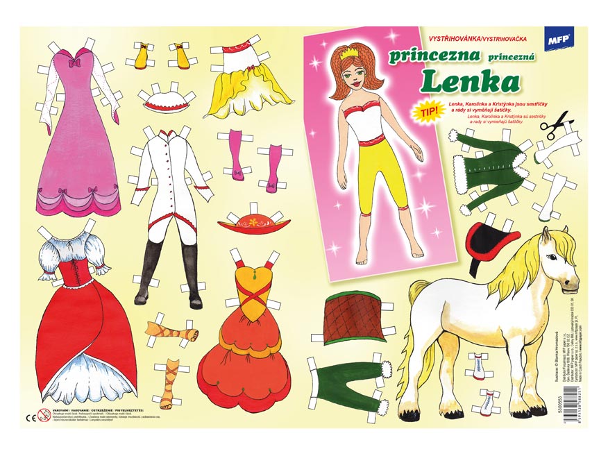 Vystřihovánky s princeznou Lenkou, vhodné pro mladé slečny. Obleč si princeznu Lenku podle svého vlastního vkusu. Vystřihovánky jsou na 2 listech formátu A4. Najdeš zde princeznu, koníka a spoustu různých šatů a doplňků. Vystřihovánky rozvíjejí kreativitu dětí pomocí různých tvarů, barev a také zlepšují motoriku ruky.